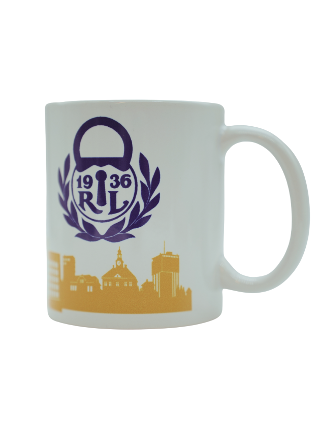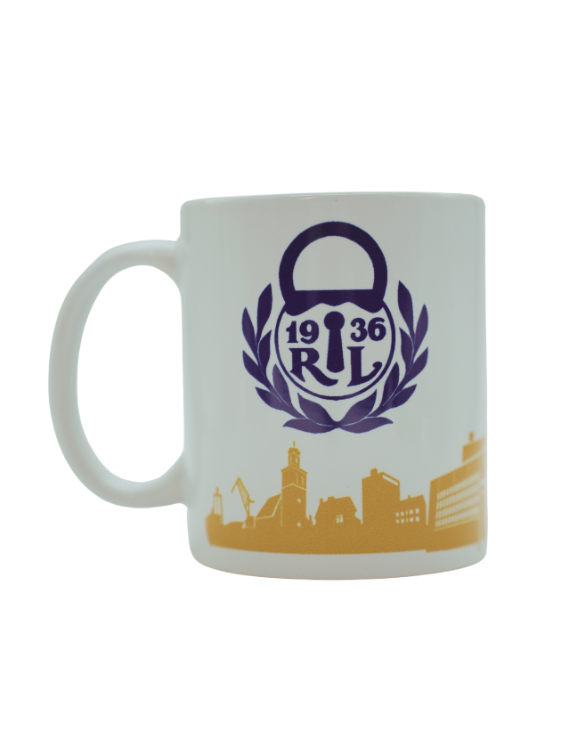 Valkoinen kahvikuppi, jossa Rauman kaupungin siluetti sekä lehväslogot.