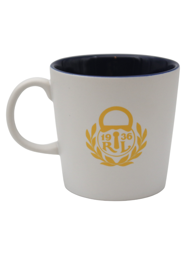 Tyylikäs kahvikuppi keltaisella lehväslogolla ja sinisellä sisustalla.
